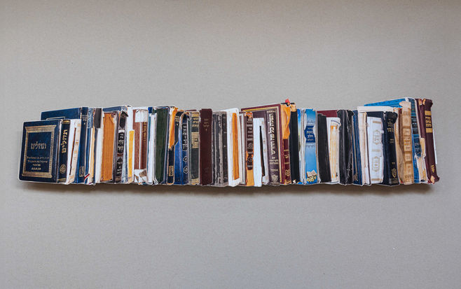 In this series of photographs I focused on used sacred books. I walked into the synagogue on an early winter afternoon, after “Minha” Service, and selected 30 Sidurim, Bible and Mishna books with the most wear and tear signs - the result of constant use by the men and women who pray there regularly. I set out on a journey with this collection, in the course of which I photographed, duplicated, printed, cut and created continuity for these unique sacred books.